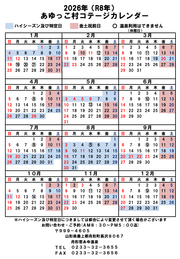 - ※ハイ・シーズン(繁忙期)あゆっこ村コテージカレンダー(2026)をご確認下さい。